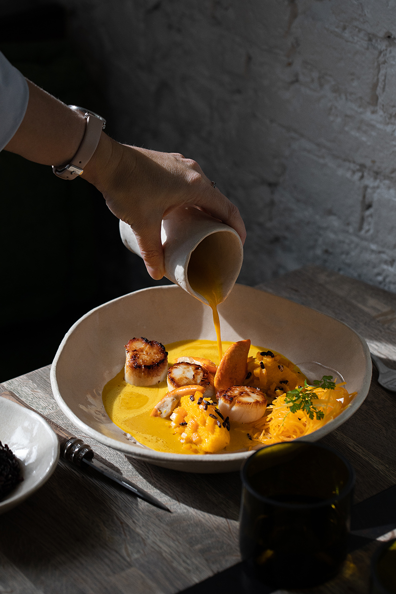 Calamars frits, sauce gribiche-15- Tourteau, chou-fleur-16-Crémeux d’œuf à la cuillère-15