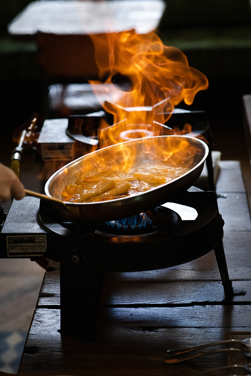 Crêpes Suzette 16- Tarte Tatin, crème double 32 (2 pers.) - Pavlova aux coings-16 -Baba au rhum, crème vanillée-15